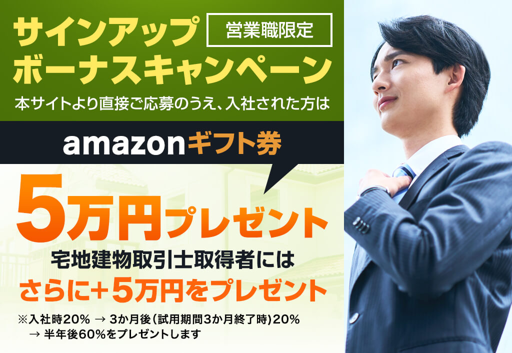 | 応募条件 | 年齢は不問です。50代・60代の方も積極採用します。 ■必須 ・普通自動車運転免許(AT限定可) ・社会人経験2年以上 ・営業経験1年以上(他業種可) ・高校卒業以上 ■歓迎 ・不動産業に限らず、営業経験が豊富な方 ・宅地建物取引士の資格 |