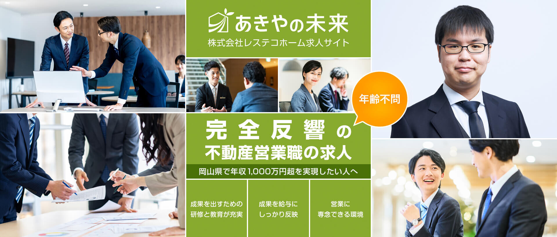 株式会社レステコホーム「あきやの未来」は岡山県の井原市・笠岡市・総社市・浅口市・矢掛町・里庄町で、空き家の有効活用を目指し、地域に新たな価値を創造する不動産反響営業職の正社員を募集しています!