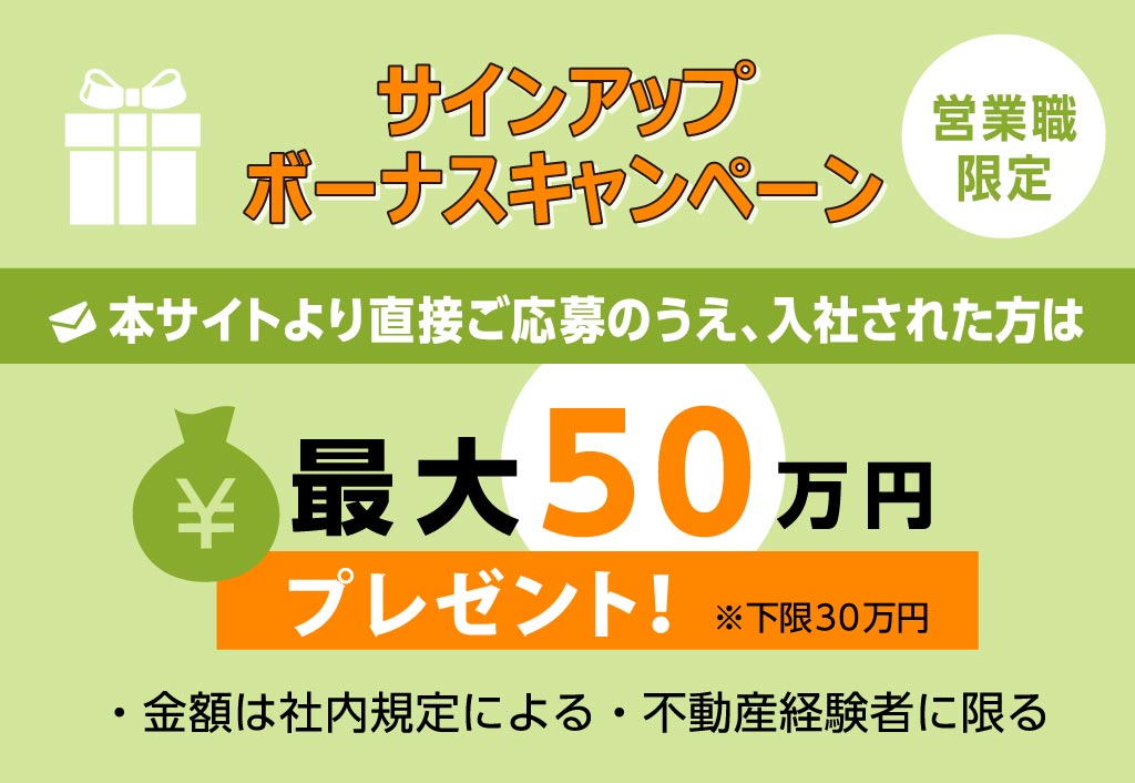 | 応募条件 | 年齢は不問です。50代・60代の方も積極採用します。 ■必須 ・普通自動車運転免許(AT限定可) ・社会人経験2年以上 ・営業経験1年以上(他業種可) ・高校卒業以上 ■歓迎 ・不動産業に限らず、営業経験が豊富な方 ・宅地建物取引士の資格 |